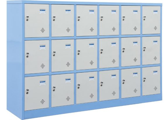 Tủ sắt để đồ sơn tĩnh điện gồm 18 khoang cánh mở, mỗi cánh có 01 khóa locker và 01 núm tay nắm.