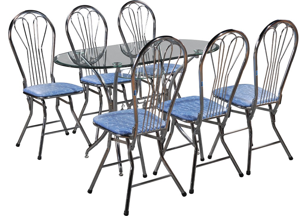 Bàn ăn kính mặt Oval khung thép mạ, bàn có thêm ngăn bằng kính.