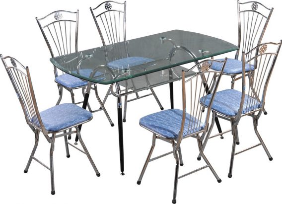 Bàn ăn khung thép mạ mặt kính, có ngăn bàn bằng kính.