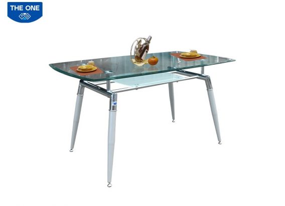 Bàn ăn khung thép mạ, mặt bàn sử dụng kính cường lực và có thêm ngăn nhỏ ở dưới.