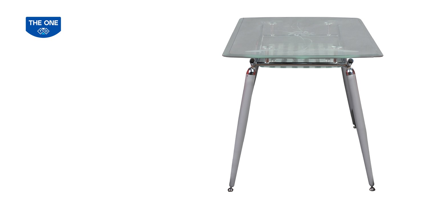Bàn ăn khung thép mạ, mặt bàn và ngăn bàn bằng kính.