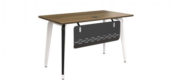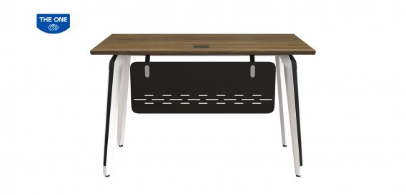 Bàn chuyên viên cao cấp mặt gỗ melamine vát cạnh 45 độ hai cạnh dài, yếm tôn đột lỗ trang trí, kết hợp chân bàn thép dập định hình sơn trắng kết hợp ốp đen