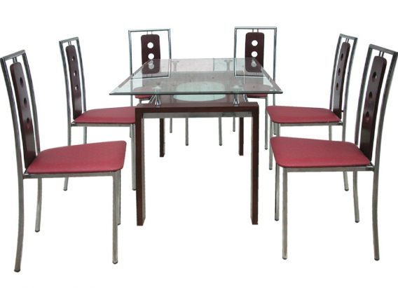 Bộ bàn ghế ăn khung thép mạ, mặt bàn kính cường lực và có ngăn nhỏ ở dưới.