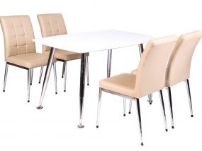 Bộ bàn ghế ăn cao cấp khung thép mạ gồm 1 bàn và 4 ghế, mặt bàn gỗ công nghiệp được phủ sơn PU cao cấp màu trắng bóng.