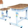 Mặt bàn và đệm tựa ghế gỗ melamine in hình con giống, mặt bàn có thể điều chỉnh độ nghiêng để phù hợp với tư thế ngồi của học sinh.