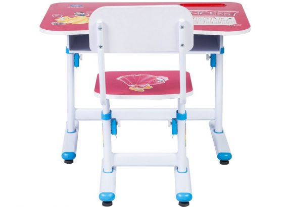Mặt bàn và đệm tựa ghế gỗ melamine in hình con giống, mặt bàn có thể điều chỉnh độ nghiêng để phù hợp với tư thế ngồi của học sinh.