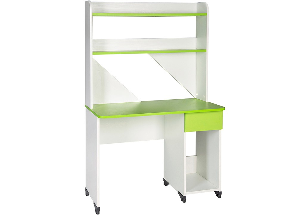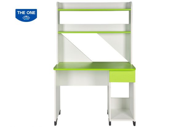 Trên mặt bàn có hệ thống giá để đồ, bàn có ngăn kéo và ngăn để đồ