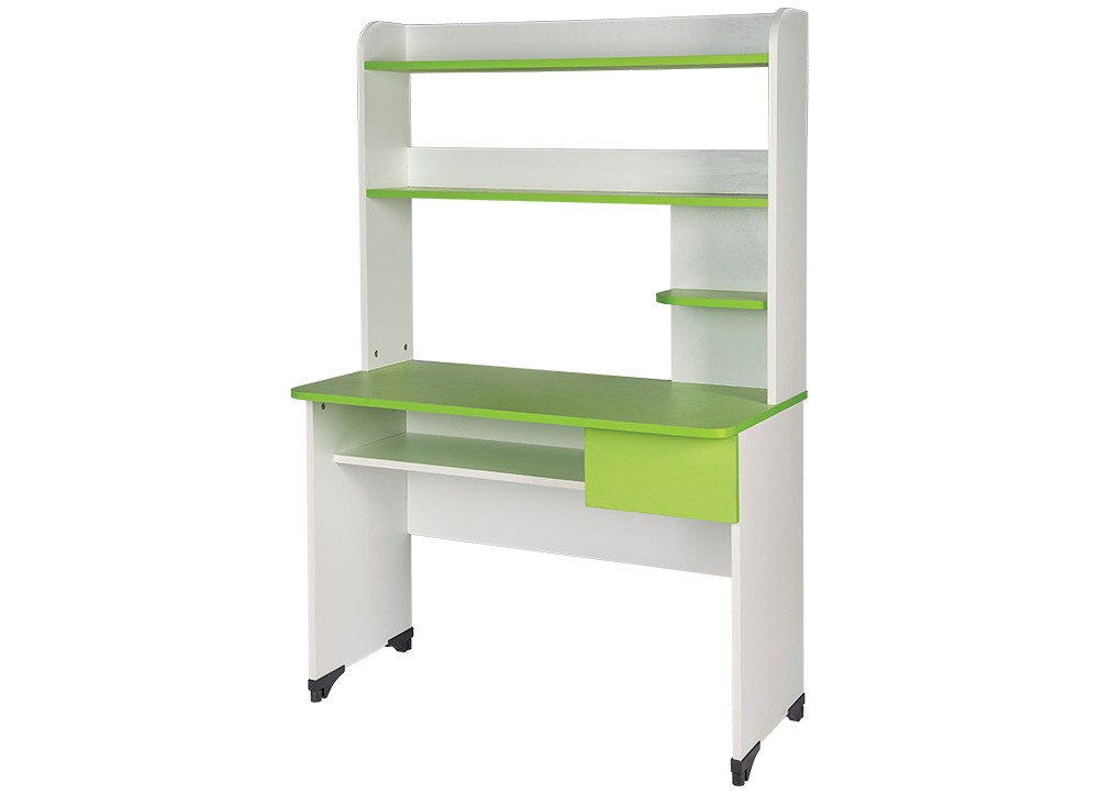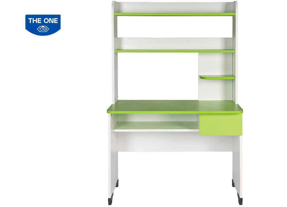 Trên mặt bàn có hệ thống giá để đồ, bàn có ngăn kéo và ngăn để đồ.