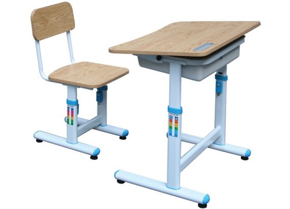 Mặt bàn và đệm tựa ghế bằng gỗ Melamine, bàn có ngăn để sách và có thể điều chỉnh độ nghiêng của mặt bàn phù hợp với tư thế ngồi học.