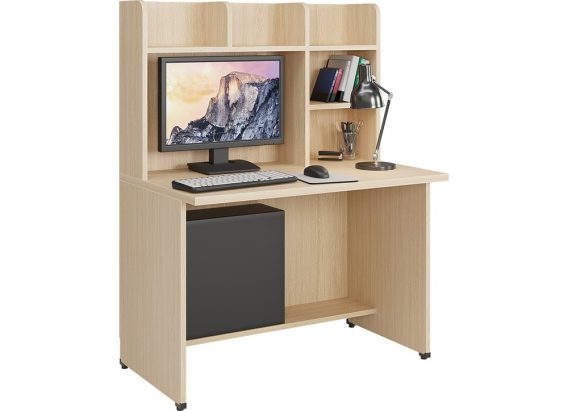 Bàn liền giá có đợt và kệ sách trên mặt bàn.