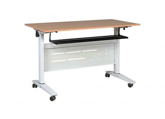 Bàn hội trường Unique khung thép sơn tĩnh điện màu trắng, mặt bàn gỗ melamine màu M14 và có thể gấp lại sau khi sử dụng.
