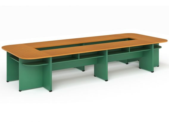 Bàn họp gỗ công nghiệp quây rỗng giữa, có các đợt để tài liệu.