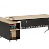 Bàn trưởng phòng cao cấp mặt gỗ meleamin, có yếm tôn, kết hợp chân bàn ống thép sơn đen và mạ. Bàn có máng điện kết hợp làm khung giằng với kết cấu chắc chắn và tiện ích khi sử dụng.