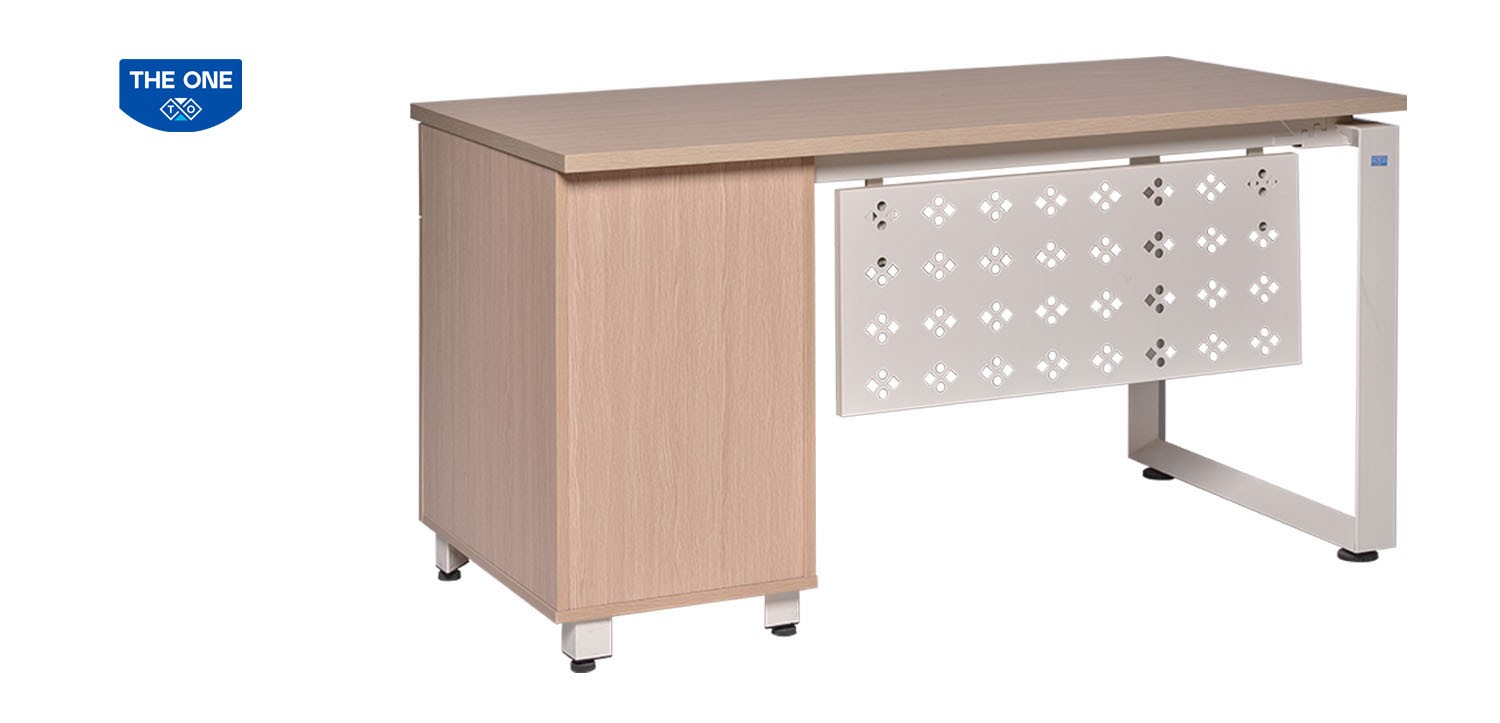 Bàn làm việc mặt gỗ melamine khung thép tam giác có hộc liền 1 ngăn kéo và 1 cánh mở.