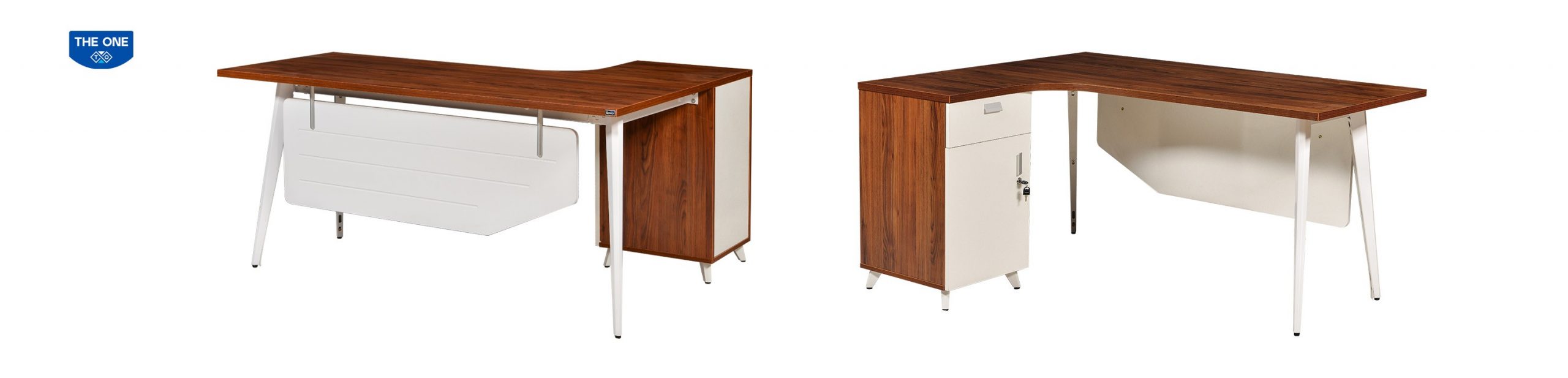 Mặt bàn gỗ Melamine màu M6 và có hộc liền kết hợp M6 và M52, bàn sử dụng yếm gỗ sơn Pu trắng.