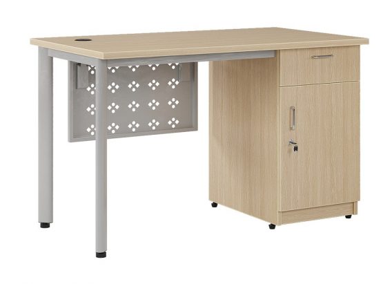 Bàn làm việc khung thép ống Oval hộc liền mặt gỗ Melamine. Bàn có yếm tôn trang trí.