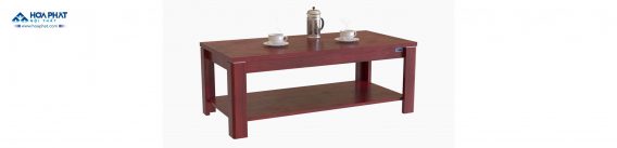 Bàn sofa mặt gỗ liền hình chữ nhật, chân bàn ghép chữ V tạo dáng và có đợt gỗ để đồ.