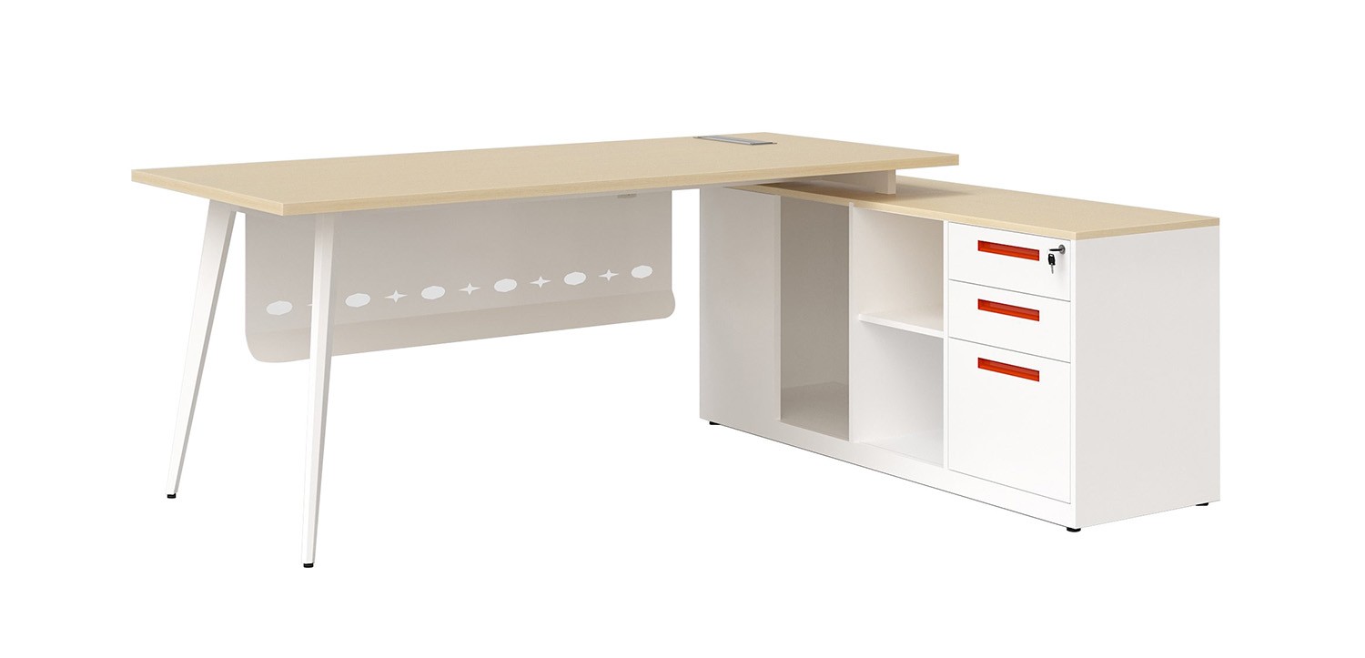 Bàn trưởng phòng sử dụng chân C10 kết hợp tủ phụ, yếm sắt cắt họa tiết trang trí, sơn màu trắng S26. Mặt bàn và nóc tủ phụ màu M14.