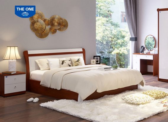 Giường ngủ được thiết kế theo phong cách hiện đại, kết hợp đồng bộ với táp có 2 ngăn kéo để đồ.