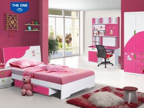 Bộ sản phẩm phòng ngủ trẻ em, sử dụng chất liệu gỗ melamine và sơn Pu cao cấp kết hợp giữa hai tông màu hồng và trắng.