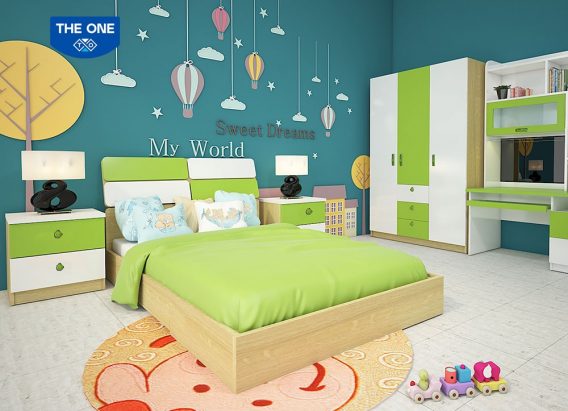 Bộ sản phẩm phòng ngủ trẻ em, sử dụng chất liệu gỗ melamine cao cấp kết hợp giữa hai tông màu xanh cốm và trắng.