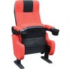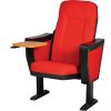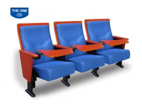 Ghế hội trường cao cấp khung thép, đệm tựa bằng mút đúc bọc vải, và ốp tựa bằng gỗ.