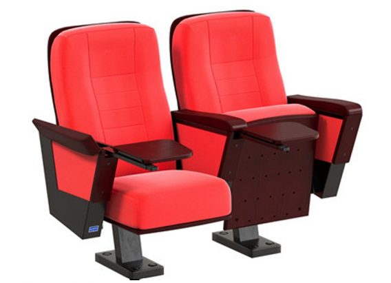 Ghế hội trường cao cấp khung thép, đệm tựa ghế bằng mút đúc bọc vải và sử dụng ốp đệm tựa bằng gỗ.