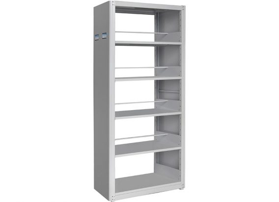 Giá thư viện 1 khoang sử dụng 2 mặt, có 5 tầng để tài liệu. Các đợt và thanh chắn có thể di động giúp điều chỉnh độ cao.