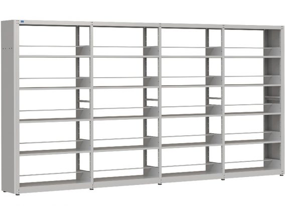 Giá thư viện 4 khoang sử dụng 2 mặt, có 5 tầng để tài liệu. Các đợt và thanh chắn có thể di động giúp điều chỉnh độ cao.
