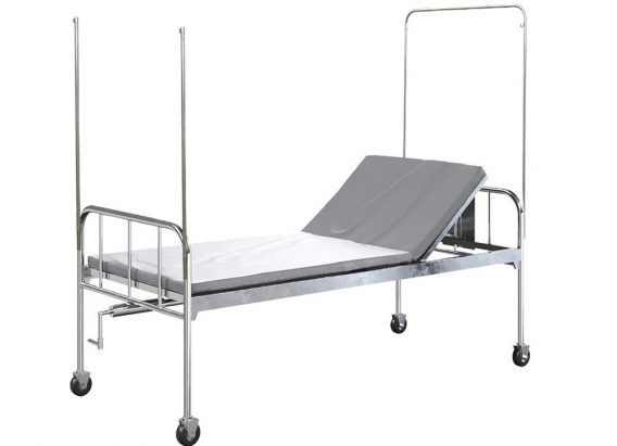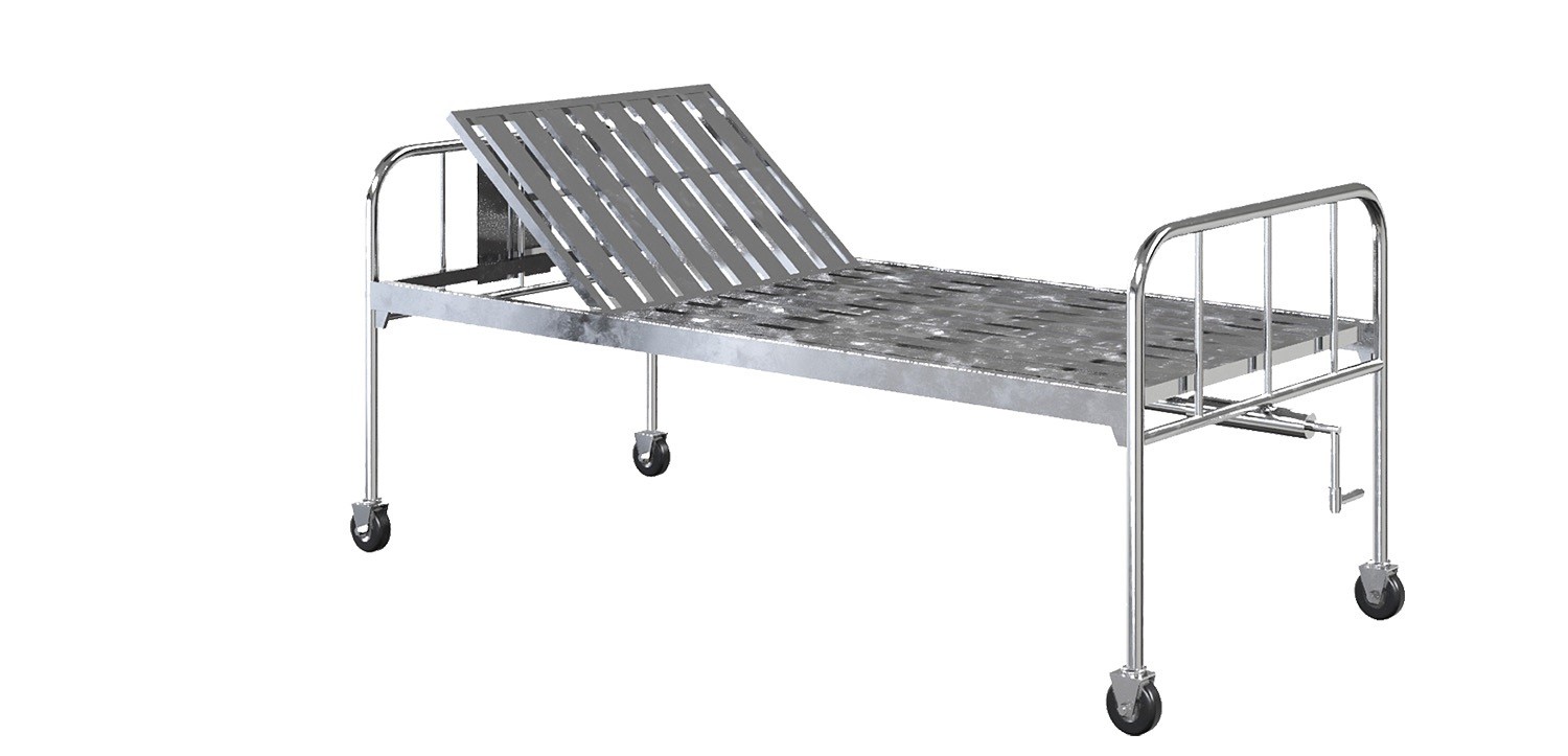 Giường y tế chân di động toàn bộ khung bằng Inox hoặc thép sơn tĩnh điện, đầu giường có thể nâng hạ bằng cơ cấu tay quay.