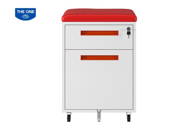 Hộc tài liệu 2 ngăn kéo sơn màu trắng, tay nắm đỏ cam sử dụng chung khóa dàn, ngăn kéo sử dụng ray bi.
