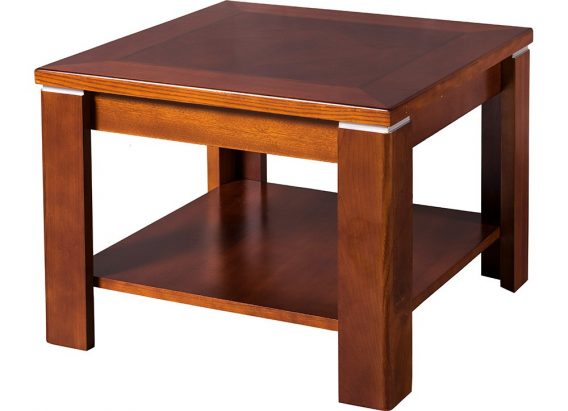 Kệ góc sofa mặt gỗ liền hình chữ nhật, chân ghép chữ V và có đợt để đồ tiện lợi.