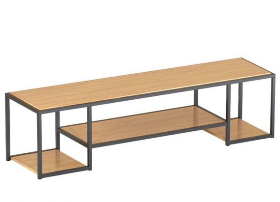 Kệ tivi khung thép sơn đen nhám kết hợp mặt bàn và đợt để đồ bằng gỗ công nghiệp dán giấy vân gỗ.
