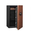 Bề mặt cánh két được trang trí màu gỗ, khóa điện tử kết hợp cảm ứng và vân tay giúp tăng tính bảo mật.