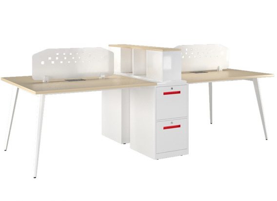 Module làm việc cho nhân viên sử dụng chân thép sơn tĩnh điện C10, ở giữa module có hộc sắt mỗi bên 2 ngăn kéo và khóa riêng biệt được sơn màu trắng.