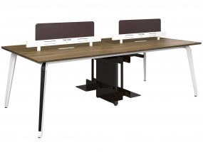 Modul làm việc 4 chỗ. Mặt bàn vát cạnh 45 độ hai cạnh dài, Bàn có vách giữa dạng hộp đi dây điện giúp tăng cứng vững cho bàn. Mặt bàn gồm 2 nắp luồn dây chung và vách ngăn kiểu mới, dạng ống khắc laze trang trí. Chân bàn thép dập định hình sơn trắng kết hợp ốp đen.