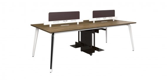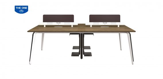 Modul làm việc 4 chỗ. Mặt bàn vát cạnh 45 độ hai cạnh dài, Bàn có vách giữa dạng hộp đi dây điện giúp tăng cứng vững cho bàn. Mặt bàn gồm 2 nắp luồn dây chung và vách ngăn kiểu mới, dạng ống khắc laze trang trí. Chân bàn thép dập định hình sơn trắng kết hợp ốp đen.