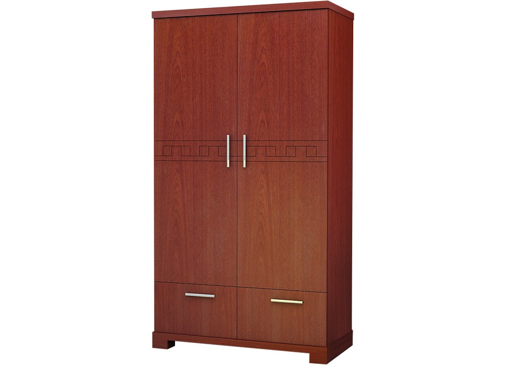 Tủ áo gia đình 2 buồng gỗ công nghiệp và phủ sơn PU. Bên trên gồm 2 cánh mở, bên dưới có 2 ngăn kéo.