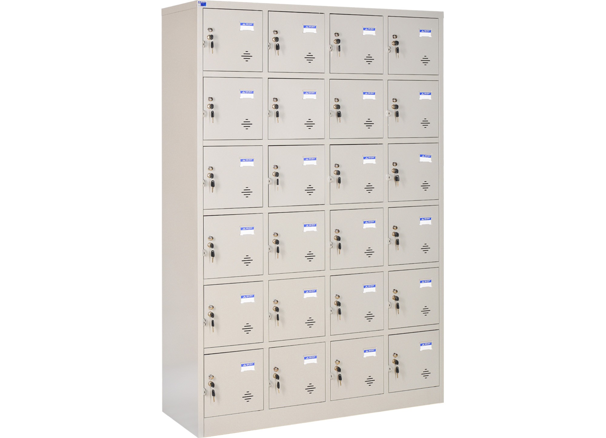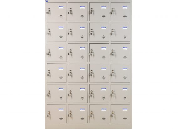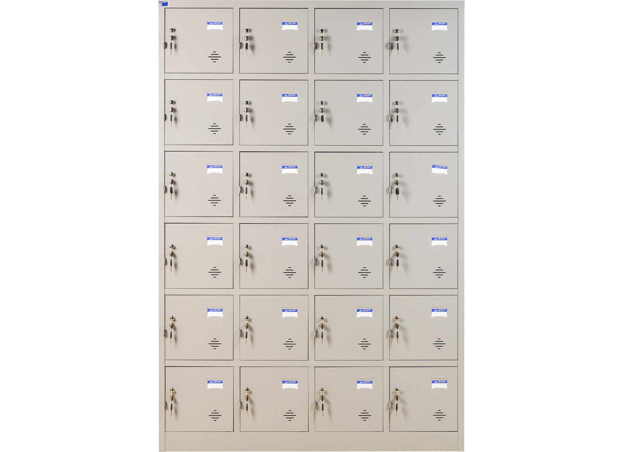 Tủ sắt sơn tĩnh điện 24 khoang cánh mở. Trên mỗi cánh có 1 khóa Locker, núm tay nắm và tai khóa móc.