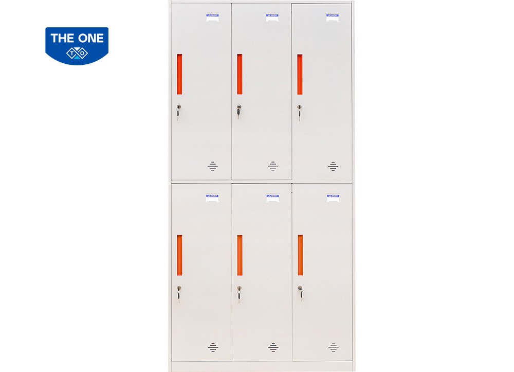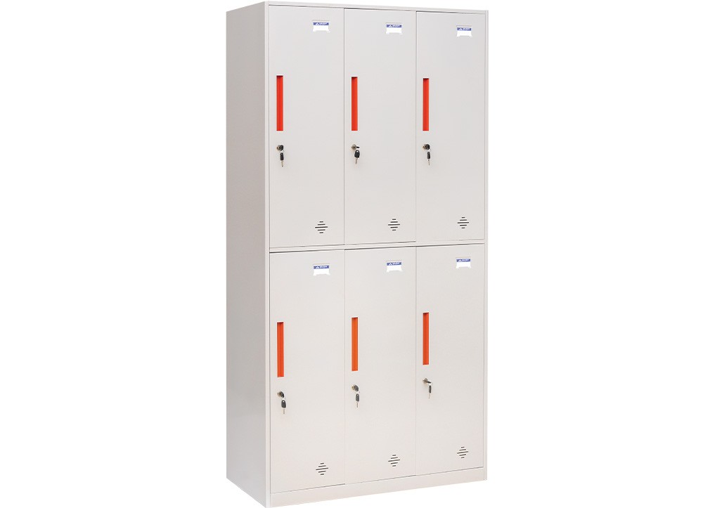 Tủ có 6 khoang cánh mở sử dụng khóa locker, mỗi khoang có 1 đợt cố định và 1 suốt treo áo.