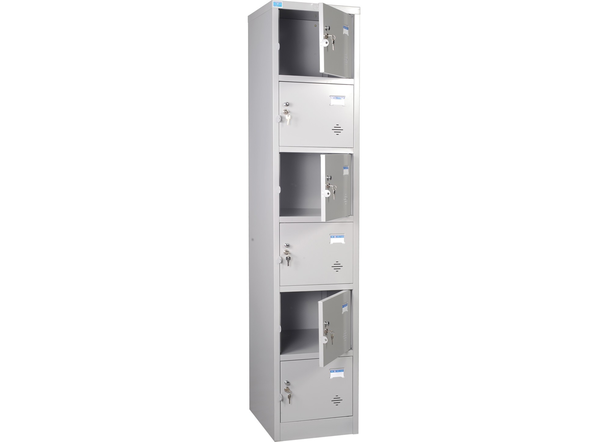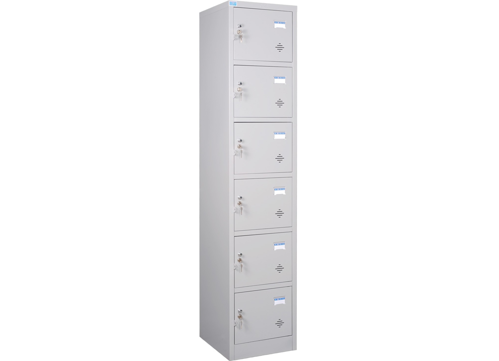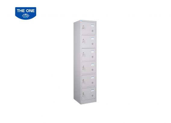 Tủ sắt sơn tĩnh điện 6 khoang cánh mở. Trên mỗi cánh có 1 khóa Locker, núm tay nắm và tai khóa móc.