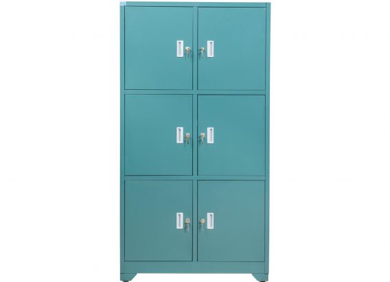 Tủ sắt thép dày gồm 6 khoang. Mỗi cánh có tay nắm và ổ khóa chìa.