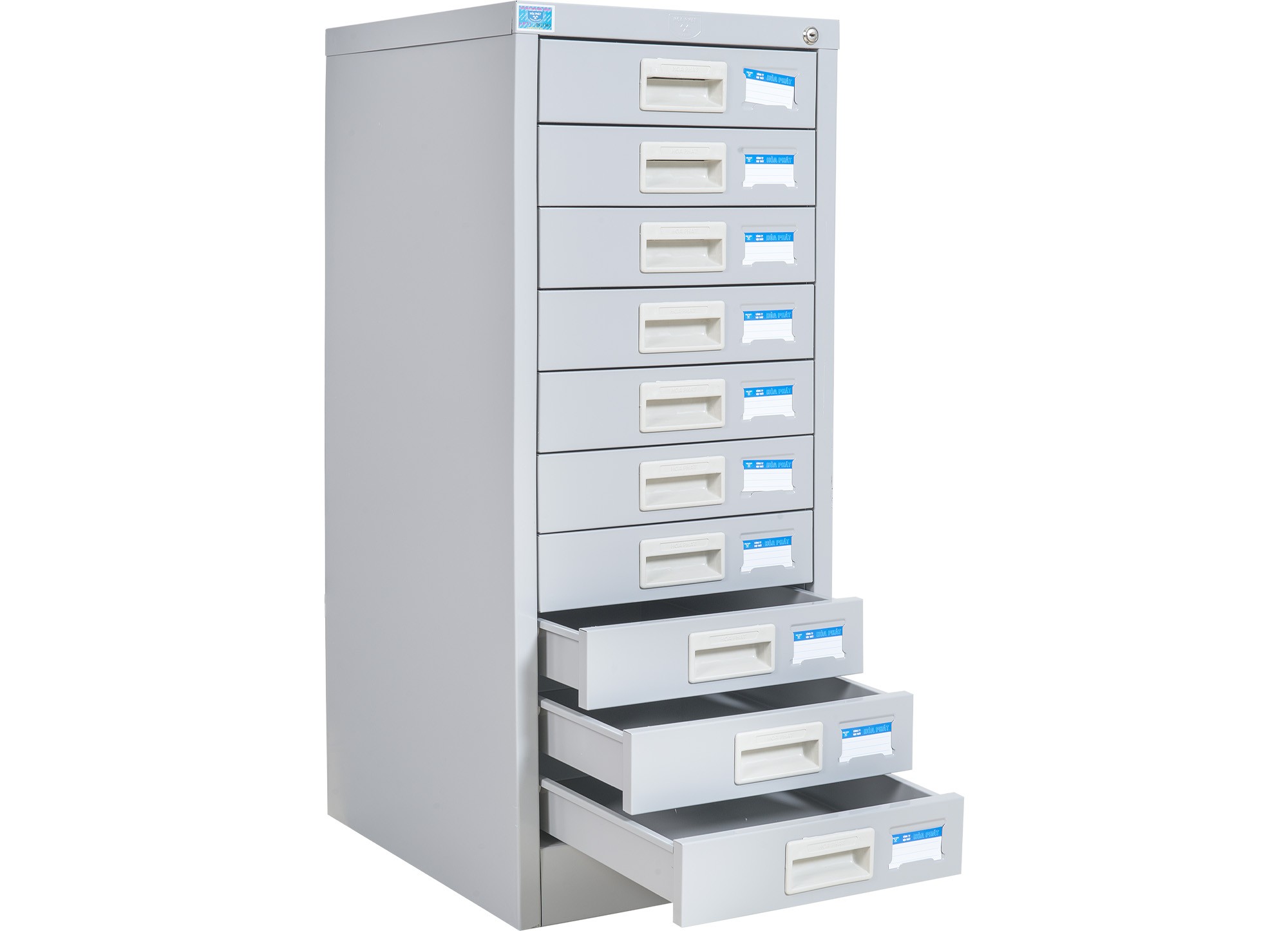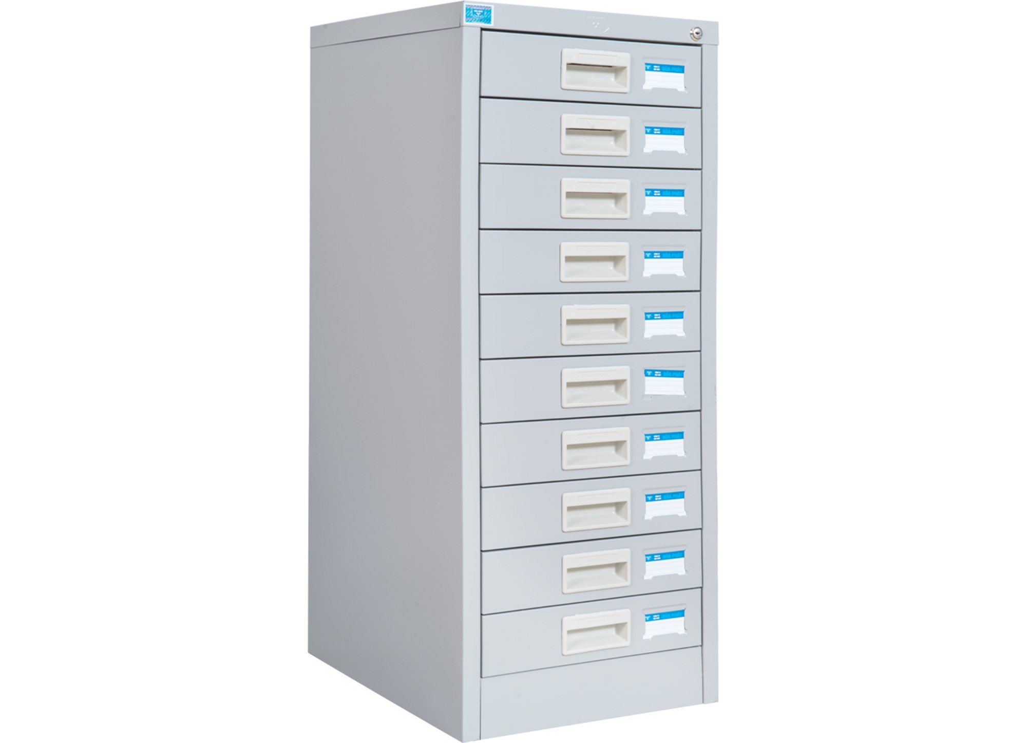Tủ sắt để file sơn tĩnh điện gồm 10 ngăn kéo chuyển động bằng cơ cấu ray thép uốn.