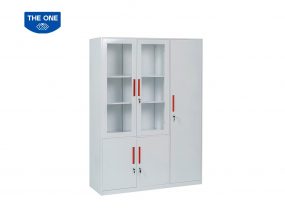 Tủ được thiết kế gồm 3 khoang với 1 khoang cánh kính mở có 2 đợt di động, khoang bên dưới là 2 cánh sắt mở và 1 khoang cánh mở dài có suốt treo quần áo, 2 đợt cố định.