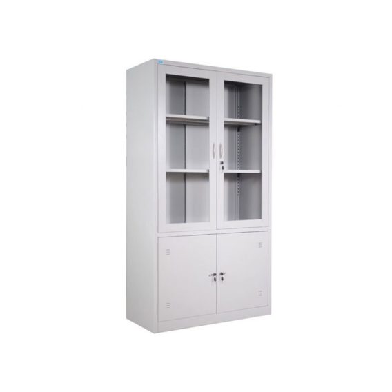 Tủ sắt sơn tĩnh điện 2 khoang: Khoang trên có 2 đợt di động và khung cánh kính mở. Khoang dưới có 2 cánh sắt mở.