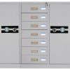 Tủ sắt sơn tĩnh điện 3 khoang: Khoang cánh sắt mở bên trong có 2 đợt di động. Khoang ở giữa có 2 đợt di động. Khoang 4 ngăn kéo sử dụng chung 1 thanh khóa dàn.