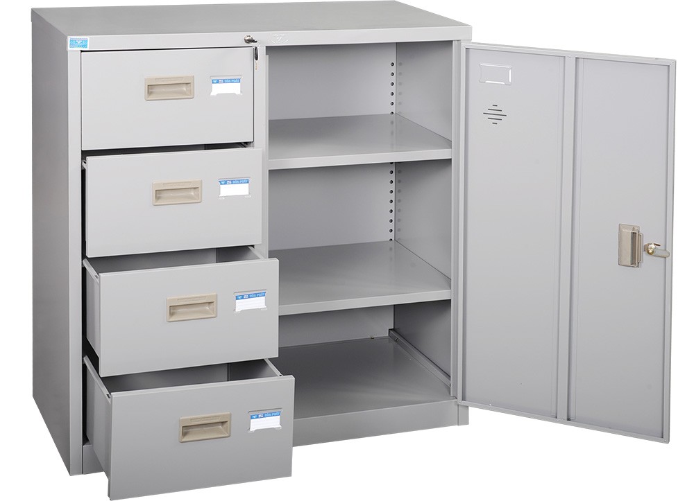 Tủ sắt sơn tĩnh điện 2 khoang: Khoang cánh sắt mở bên trong có 2 đợt di động. Khoang 4 ngăn kéo sử dụng chung 1 thanh khóa dàn.