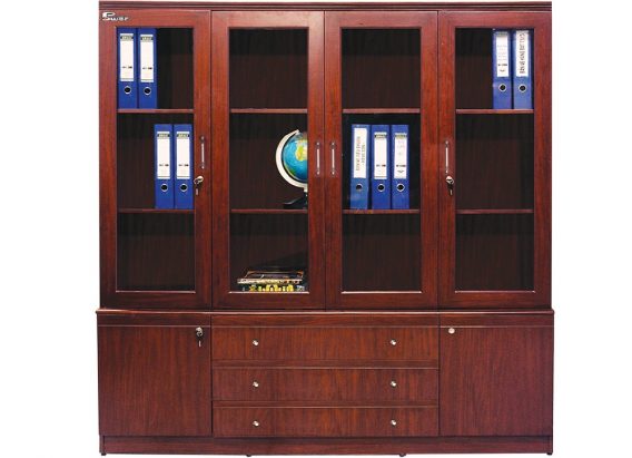 Tủ tài liệu gỗ sơn Pu có 4 buồng, phía trên gồm 4 khoang cánh kính để tài liệu, phía dưới có 3 ngăn kéo và hai cánh gỗ mở.