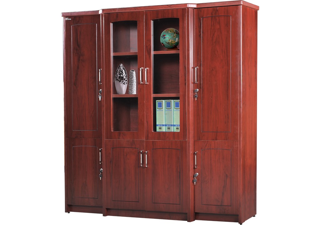 Tủ tài liệu gỗ sơn Pu gồm 4 buồng, hai buồng phía ngoài là khoang cánh dài treo áo. Hai buồng giữa phía trên là khoang cánh kính có đợt để tài liệu, phía dưới là 2 cánh gỗ mở.