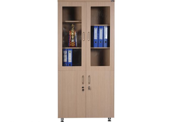 Tủ tài liệu 2 buồng, phía trên là 2 khoang cánh kính để tài liệu và phía dưới là 2 khoang cánh gỗ mở.